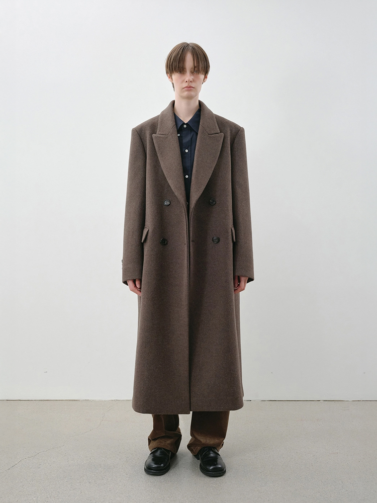 A double coat in a melange khaki brown tone with a subtle olive undertone. Crafted from a light felted wool–cashmere blend, it offers a soft yet structured drape. Reinforced shoulders maintain a clean silhouette, while the gently curved peaked lapels and double-breasted closure create a refined classic mood. Finished with full lining, a deep back vent, and inner pockets for balanced functionality as a winter outerwear piece. The calm, muted olive–khaki brown hue harmonizes naturally with various winter textures and tones. |