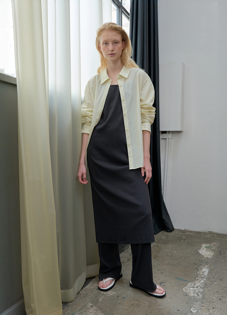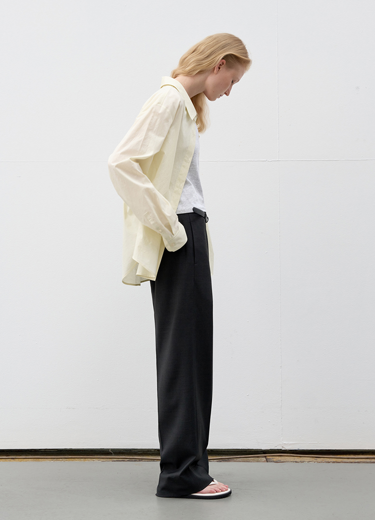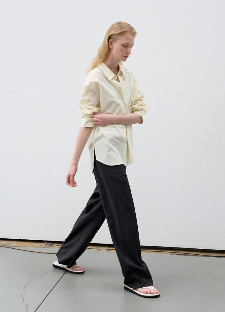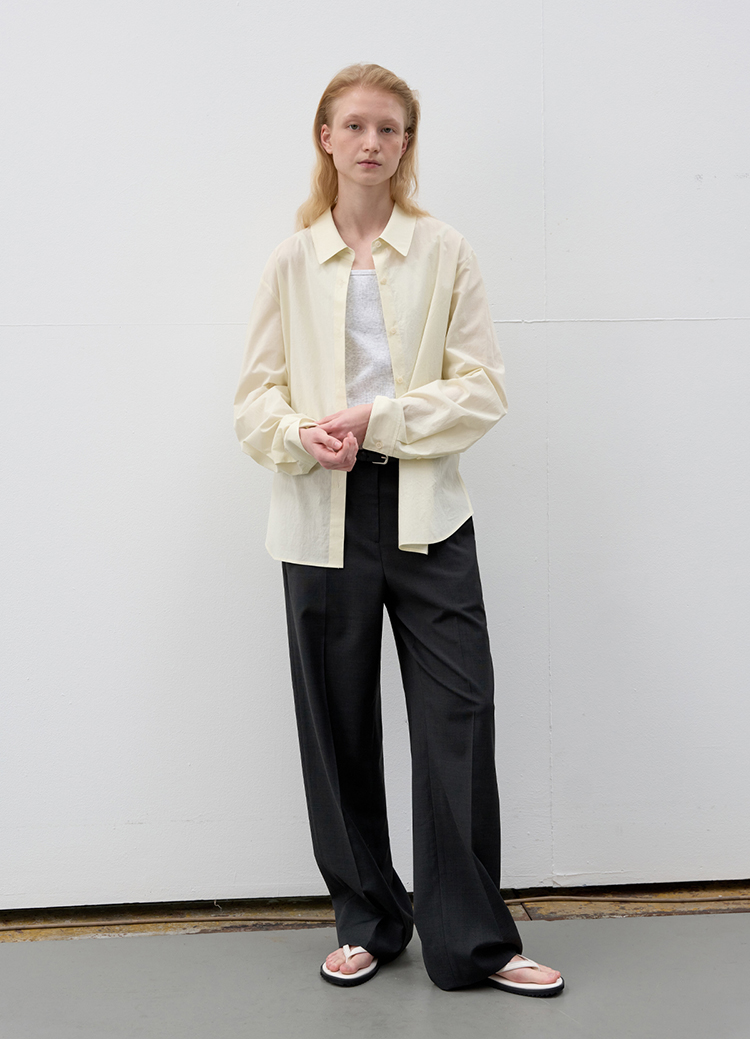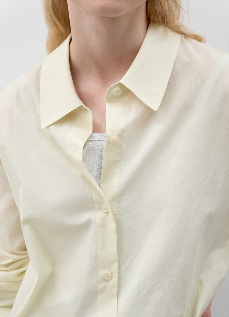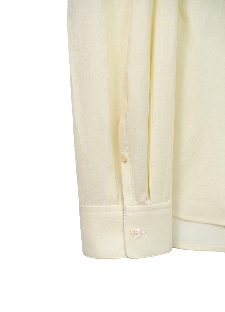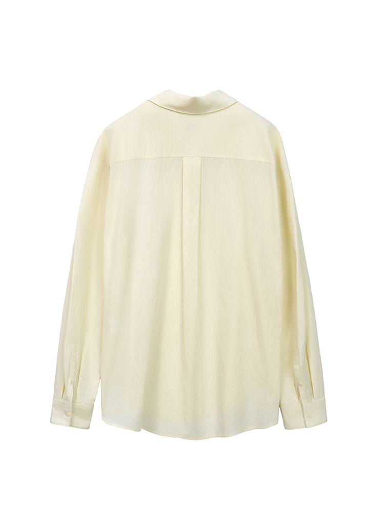 A loose standard shirt in a soft butter tone. |